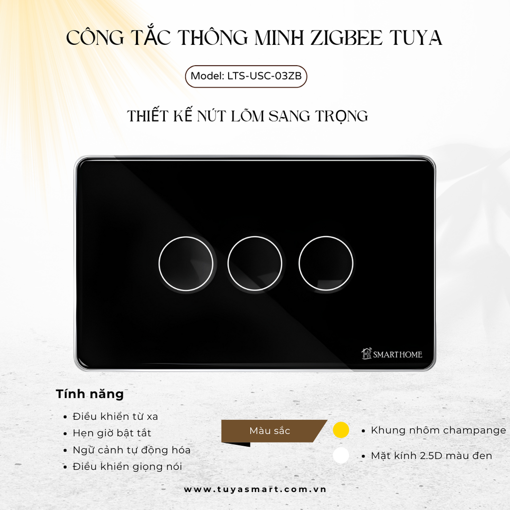 Công tắc thông minh thương hiệu LUTA SMART với viền hợp kim nguyên khối, phay CNC sắc nét sang trọng, mặt kính cường lực cảm ứng kết nối Internet thông qua bộ điều khiển trung tâm Zigbee Gateway cho phép bật/ tắt các thiết bị chiếu sáng, quạt, tivi, điều hòa… từ mọi nơi thông qua ứng dụng Luta Smart/ Smart Life trên điện thoại thông minh.